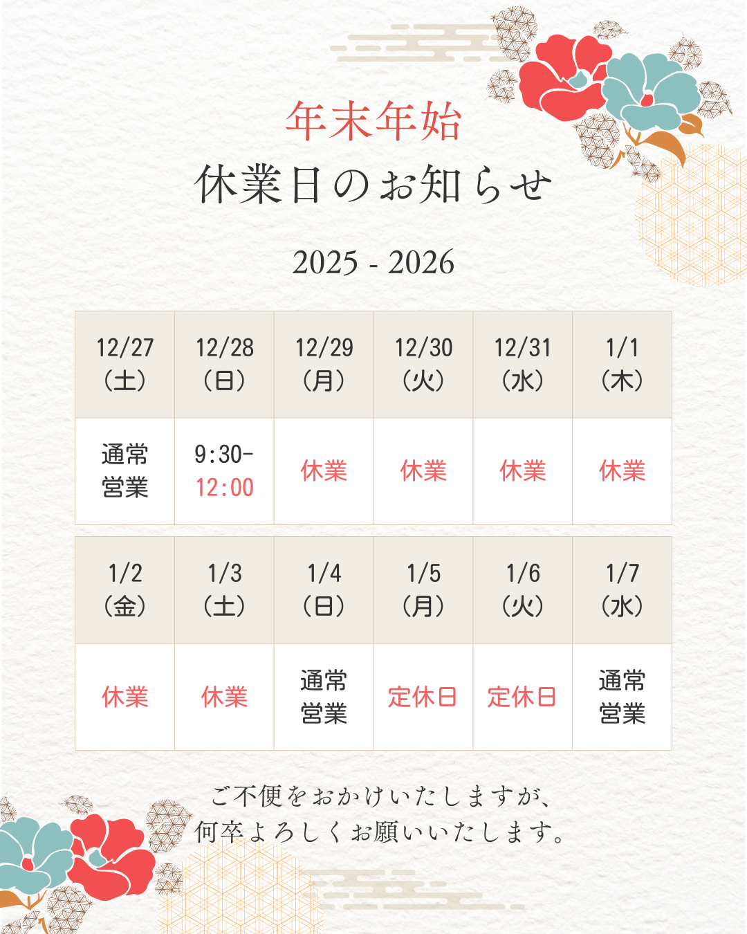 本日は年末年始休業のお知らせです!
